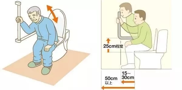 馬桶旁要安裝扶手,位置設定在離馬桶15~30mm墻壁上,方便老人如廁后,順手拉住扶手,支撐身體站起來。