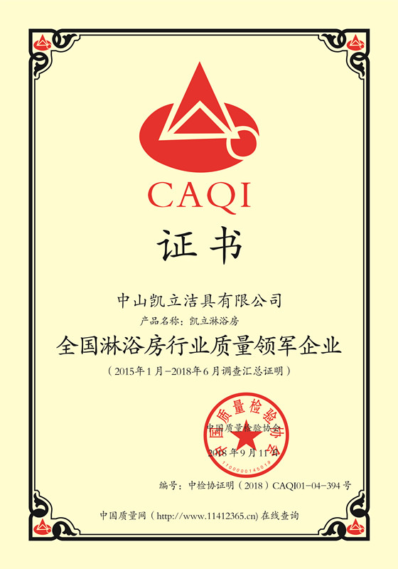 近日,中山凱立潔具有限公司獲得由中國質(zhì)量檢驗協(xié)會頒發(fā)的《全國衛(wèi)浴行業(yè)質(zhì)量領(lǐng)先品牌》、《全國產(chǎn)品和服務(wù)質(zhì)量誠信示范企業(yè)》、《全國質(zhì)量檢驗穩(wěn)定合格產(chǎn)品》、《全國質(zhì)量誠信示范企業(yè)》、《全國淋浴房行業(yè)質(zhì)量領(lǐng)軍企業(yè)》五項榮譽(yù)證書。
