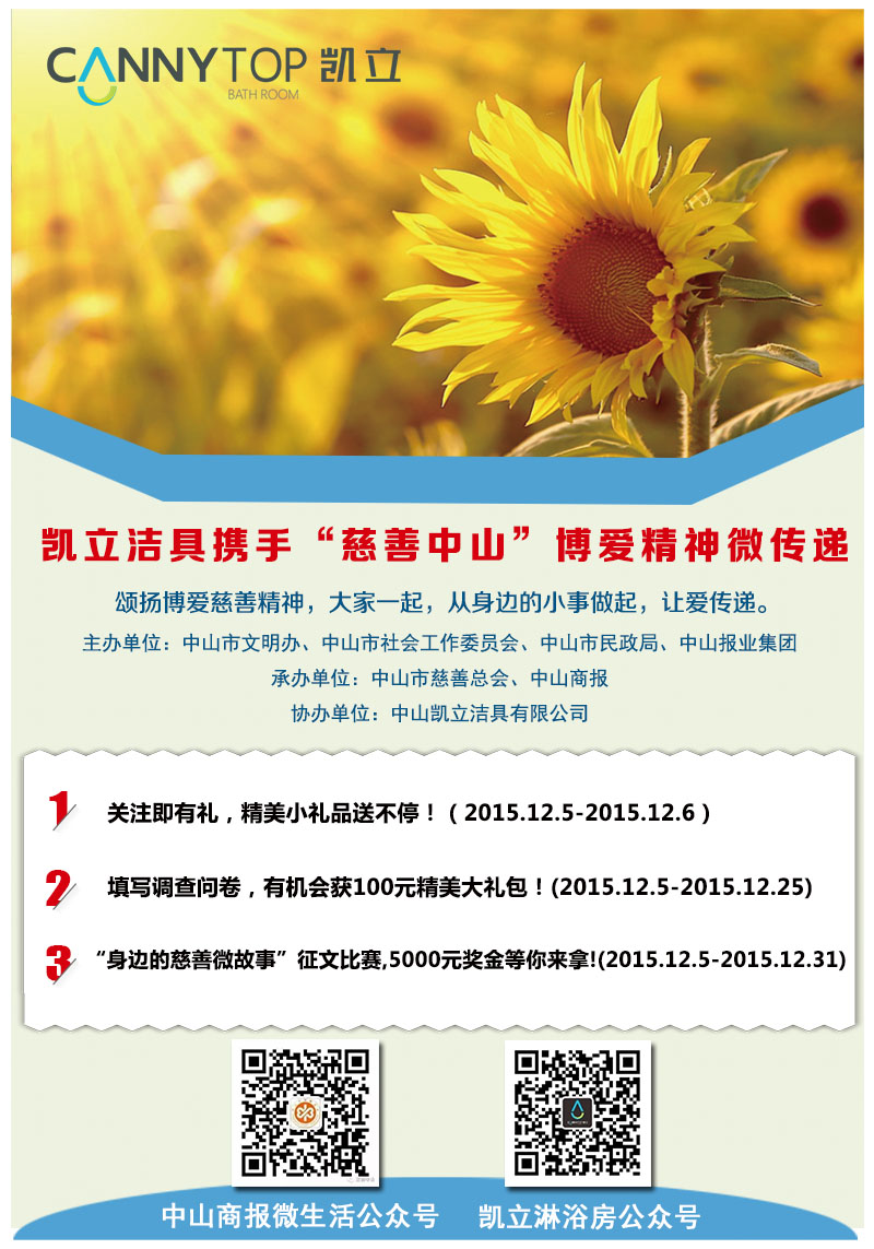 為了讓大家進(jìn)一步了解“慈善中山”,進(jìn)一步加強全市民政系統(tǒng)內(nèi)的誠信體系建設(shè),助力經(jīng)濟發(fā)展轉(zhuǎn)型升級,宣傳我市民政系統(tǒng)在積善、誠信等工作領(lǐng)域的工作成績,讓誠信、積善等理念走向千家萬戶,中山報業(yè)傳媒與市慈善總會聯(lián)合主辦了“誠信?慈善周末行”活動。12月5、6日兩天,市民在“誠信?慈善周末行”活動(博覽中心)現(xiàn)場可以找到你們的新朋友“慈善中山”。在現(xiàn)場找到“慈善中山”的攤位掃二維碼。或直接搜索慈善中山(cishanzhongshan),點擊關(guān)注,即可在現(xiàn)場獲贈一份由凱立潔具公司贊助的精美小禮品。